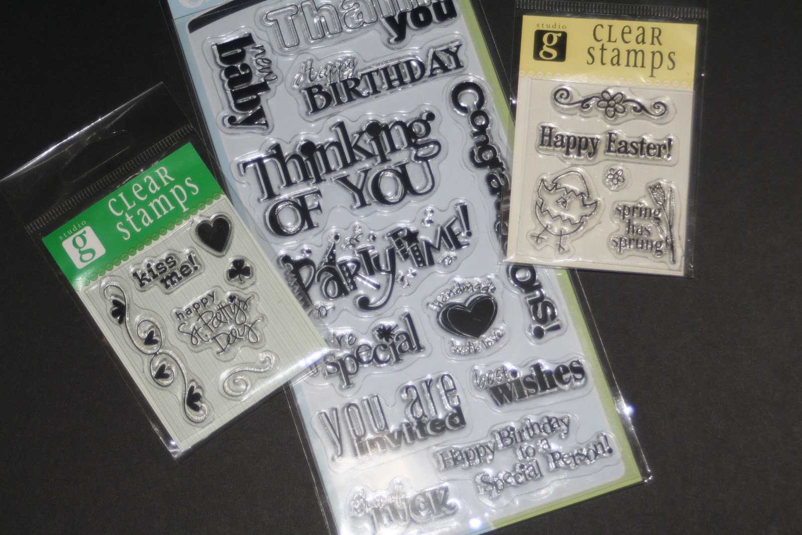 Two Studio G Clear Stamps (one for St. Patrick's and one for Easter) and an Inkadinkado Clear Stamp Set with 12 All Occasions Stamps.